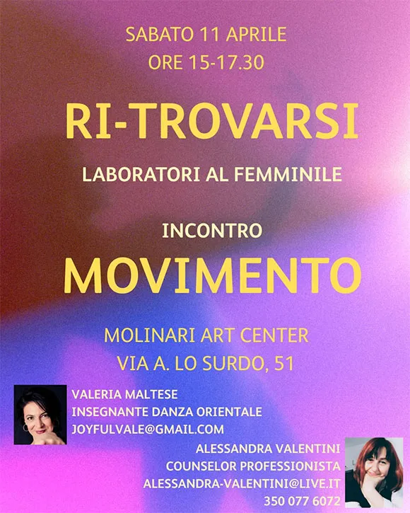 Vi aspettiamo a sperimentare un pomeriggio di MOVIMENTO con il Counseling e la Danza Orientale con la maestra Valeria Maltese.